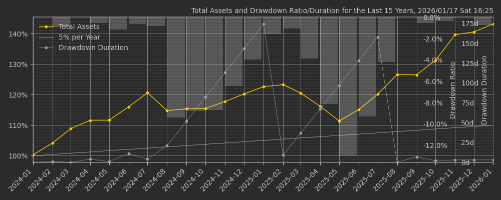 注:総投資資産の変動率グラフ(Total Assets and Drawdown Ratio/Duration)は、2024年1月1日にポートフォリオ「オルカン70%、VGLT30%」で運用を始めたことを想定して総評価額の推移をグラフにしています。直近の最高値からの下落率(Drawdown Ratio)と経過日数(Drawdown Duration)も合わせて表示します。実際の運用では投資資産の売買や毎月のVGLT分配金(年利数パーセント)があったり、リバランスを実施する可能性もありますが、それらは考慮しないことにします。